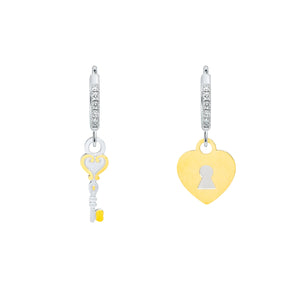 Orecchini a cerchio con cristalli e chiusura a scattino con piccola serratura a forma di cuore e chiave pendente.